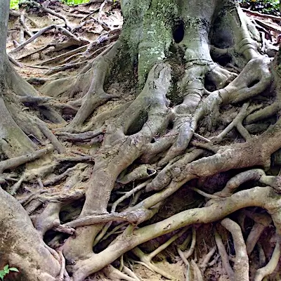 The rhytidome is the most familiar part of bark, being the outer layer that covers the trunks of trees. It is composed mostly of dead cells and is produced by the formation of multiple layers of suberized periderm, cortical and phloem tissue. The rhytidome is especially well developed in older stems and roots of trees. In shrubs, older bark is quickly exfoliated and thick rhytidome accumulates. It is generally thickest and most distinctive at the trunk or bole (the area from the ground to where the main branching starts) of the tree.